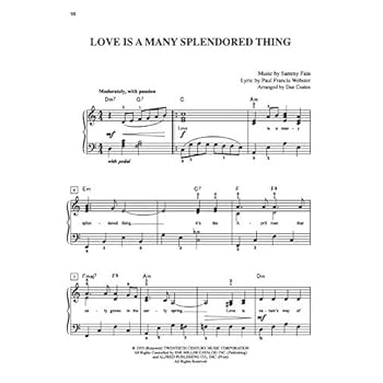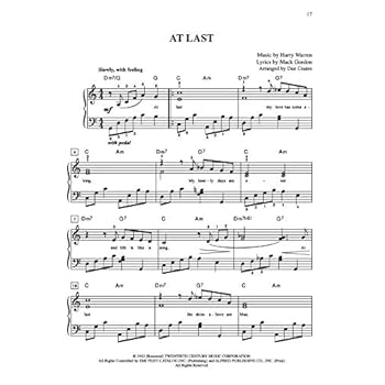 Fifty of the most popular romantic hits ever written are now at your fingertips! This wide-ranging collection spans the worlds of movies, pop, Broadway and jazz. Each intermediate-level arrangement includes lyrics and chord symbols. Titles: A Certain Smile * Amazed * Angel Eyes * As Time Goes By * At Last * Beautiful (As You) * Beauty and the Beast * Because You Loved Me * Can You Feel the Love Tonight * Can You Read My Mind? * Come Rain or Come Shine * Endless Love * The Gift * Hold Me, Thrill Me, Kiss Me * How Could I Ever Know? * How Deep Is Your Love * How Do I Live * I've Grown Accustomed to Her Face * I Believe In You and Me * I Don't Want To Miss A Thing * I Get a Kick Out of You * I Only Have Eyes for You * Killing Me Softly With His Song * La vie en rose * Laura * Let's Do It (Let's Fall in Love) * Love Is a Many Splendored Thing * Misty * Moonlight Serenade * My Funny Valentine * The Prayer * The Rose * Somewhere, My Love * Take My Breath Away * Taking a Chance on Love * This I Promise You * This Kiss * This Magic Moment * Up Where We Belong * Valentine * Weekend in New England * When a Man Loves a Woman * Where or When * The Wind Beneath My Wings * You'll Never Know * You Light Up My Life * You Make Me Feel So Young * You Raise Me Up * (Your Love Has Lifted Me) Higher and Higher * A Whole New World.